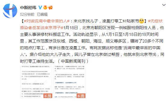有网友据此称他是“流调中最辛苦的中国人”。据介绍他的大儿子走失,因儿子曾在北京做过帮厨,他就来到北京寻找,同时打零工维持生活。(中国新闻周刊)