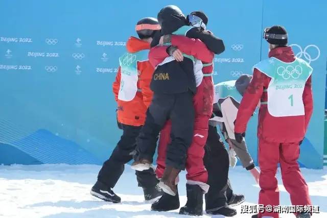 单板滑雪男子大跳台决赛中,小将苏翊鸣夺得冠军,其他选手纷纷与他拥抱庆祝!