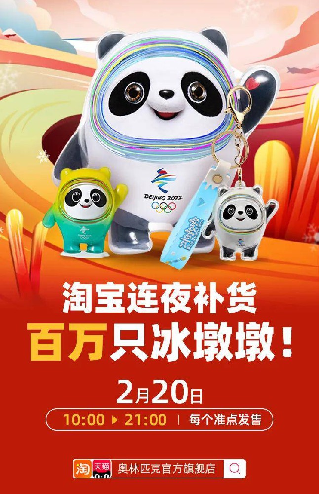 2月20日,冬奥会闭幕日,百万个冰墩墩周边在天猫上架,涵盖毛绒、手办、盲盒、立体钥匙扣等爆款。