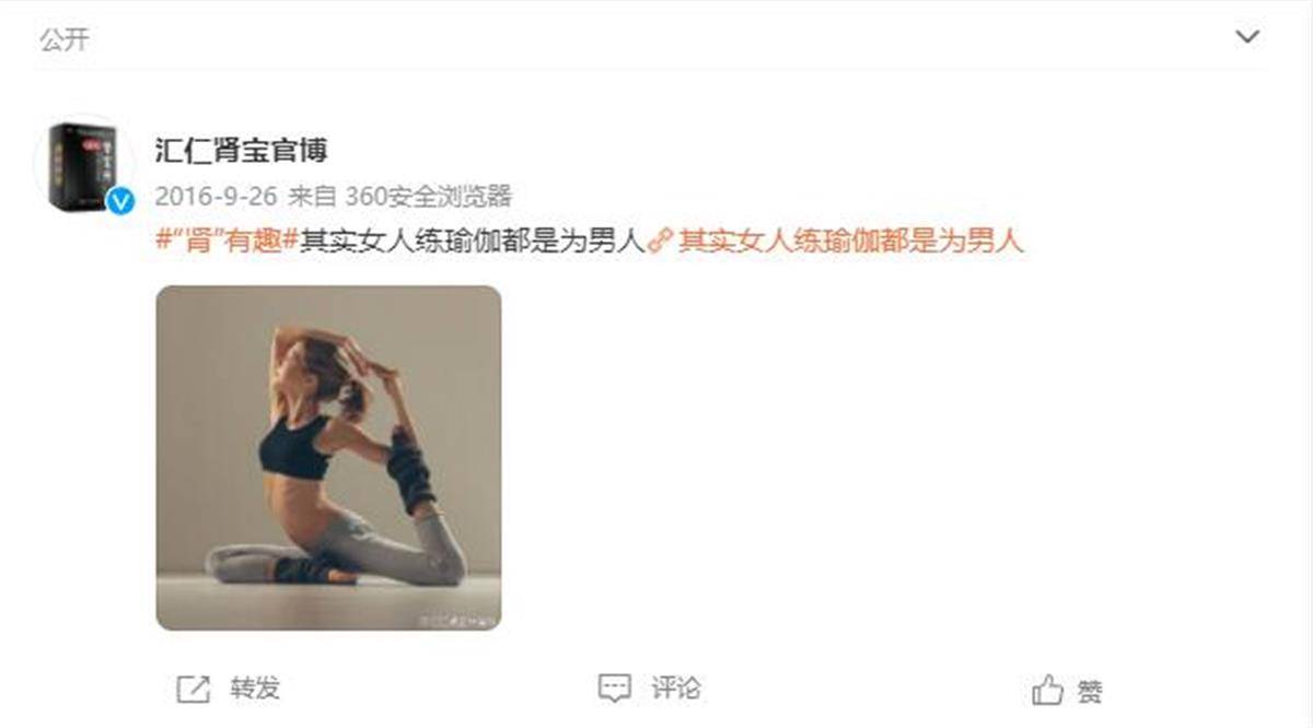 3月7日,记者搜索汇仁肾宝各平台官方账号发现,汇仁肾宝已将部分文章删除,发布于2016年的《其实女人练瑜伽都是为了男人》一文仍保留在其官方微信公众号中。