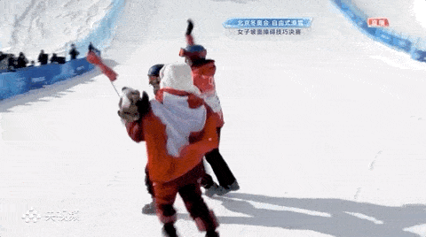 在昨天的自由式滑雪女子坡面障碍技巧决赛中,瑞士队选手玛蒂尔德·格雷莫德夺冠,获得银牌的谷爱凌大声欢呼,上前与她拥抱庆祝!