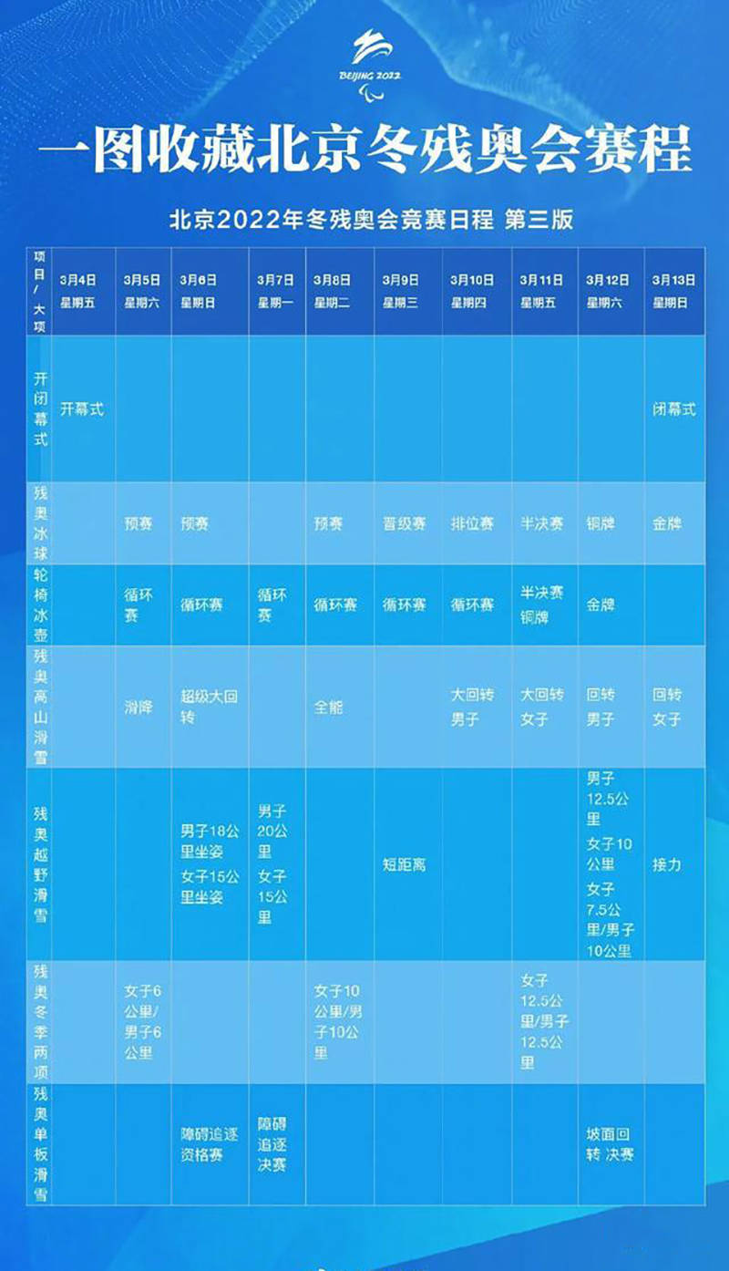 据悉,冬残奥会的赛程表已经新鲜出炉了: