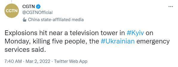 据CGTN消息,乌克兰紧急情况部门表示,基辅一处电视塔附近3月1日发生多起爆炸,造成5人死亡。